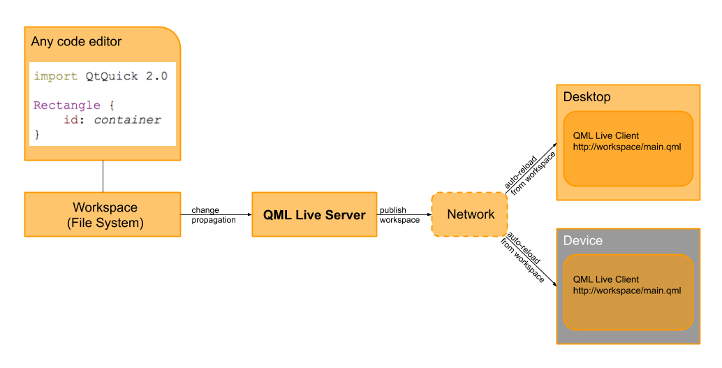 - publishes each file change to all local and remote QML Live Runtimes on the embedded devices
