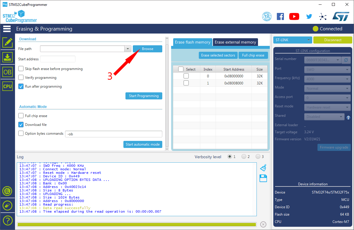 Open STM32CubeProgrammer and follow these steps: