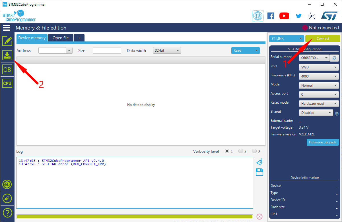 - Select Connect to estabilish connection with the onboard ST-LINK Programmer.