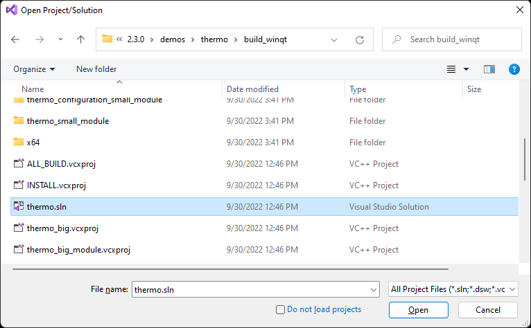 cmake --build . --target thermo_big --config ReleaseNote: The prebuilt libraries for the Qt platform are available only for Debug and Release configurations. On Windows other build types might lead to linking errors.