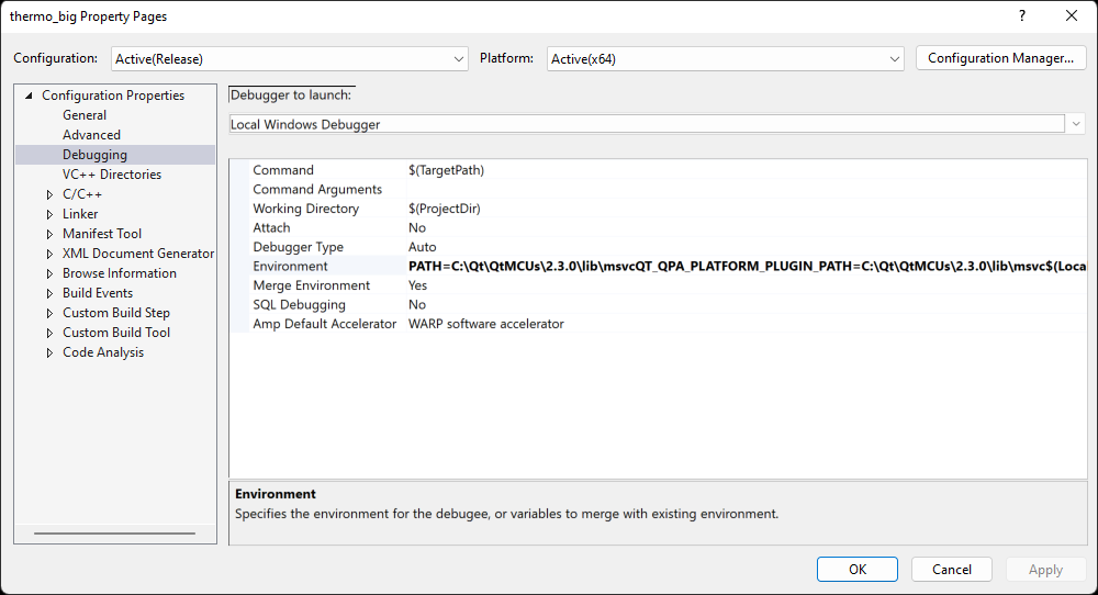 PATHandQT_QPA_PLATFORM_PLUGIN_PATHvariables pointing to the directory containing the Qt libraries, which are installed into thelib\msvcdirectory of yourQUL_ROOT. For example:PATH=%QUL_ROOT%\lib\msvc QT_QPA_PLATFORM_PLUGIN_PATH=%QUL_ROOT%\lib\msvc
