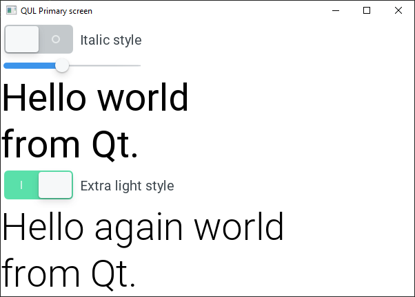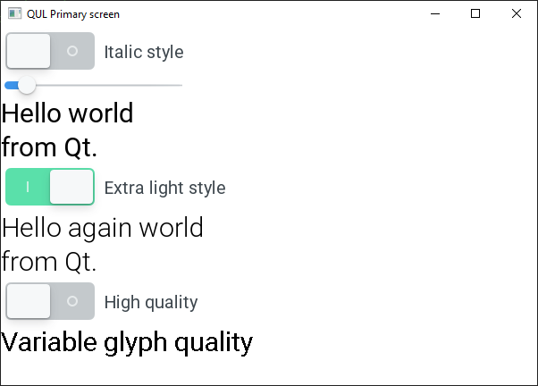 This example demonstrates how to write bindings on font properties. The binding support is available only when the Spark Font engine is used. The example's UI uses a slider control to change the text size, and switch controls to toggle the text style and glyph rendering quality.