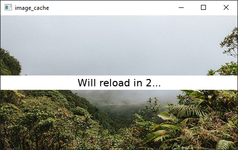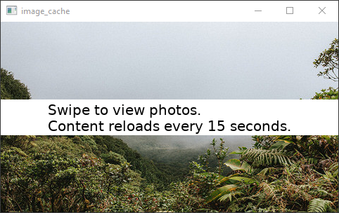 The example shows two sets of images. The current set is changed every reloadInSeconds seconds and the cache size is set to fit 4 images at a time, which is the amount of images in each image set. Thus, the cache can hold all images from the currently active image set. Images are loaded into the cache when they are requested to be rendered on the display - when a new image is accessed by swiping. When the cache is full, it removes the oldest image to free the space for the currently requested image.