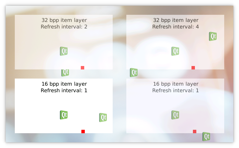 - ItemLayer with ID bpp32layer demonstrates rendering of items with different refresh intervals. In this case the red box moves every fourth refresh interval. Rendering hints are a way for a backend to select appropriate layer implementation and possibly use slightly different rendering approaches when certain hints are enabled. In this example you hint to the platform to favor size optimizations over speed optimizations.