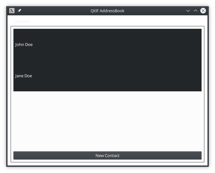 default: [[ "John", "Doe", "12345" ], [ "Jane", "Doe", "67890" ]]The JSON fragment assigned to the default variable is parsed by the Qt Interface Framework Generator and will be used to generate a simulation back end which creates two Contact instances and returns them as content for the contacts model.