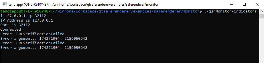 For each safety-critical QML type in Indicators, Monitor reads the expected CRC (Cyclic Redundancy Check) value from the layout file and compares it with the actual CRC value. Monitor prints the failed verification result either to the Qt Creator's Application Output window or standard output stream.