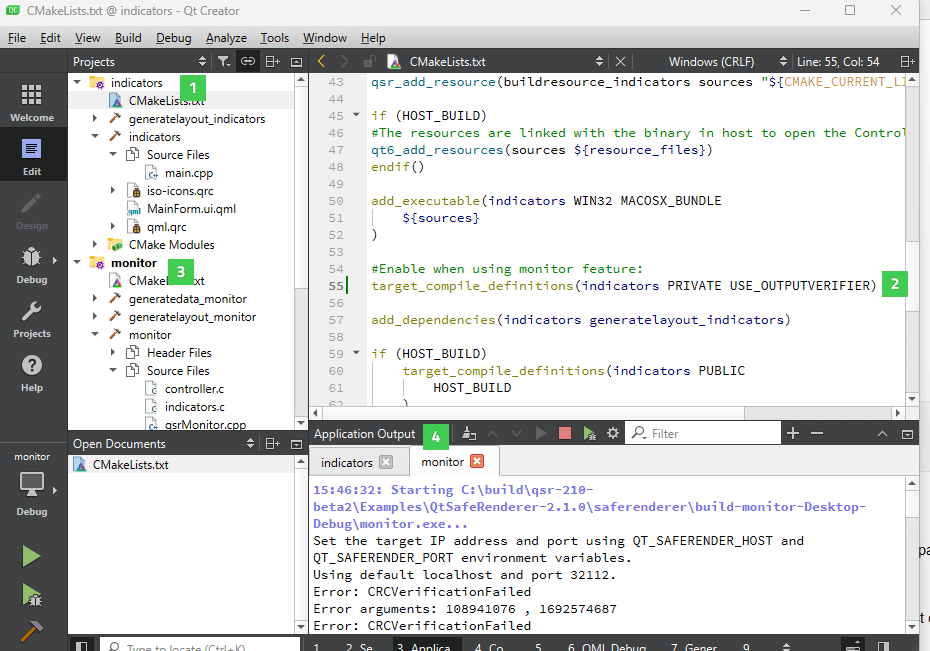 Open Indicators (1) and Monitor (3) in Qt Creator's Edit mode and select Build > Run for both examples. See Building for Host Platform for more detailed building instructions.