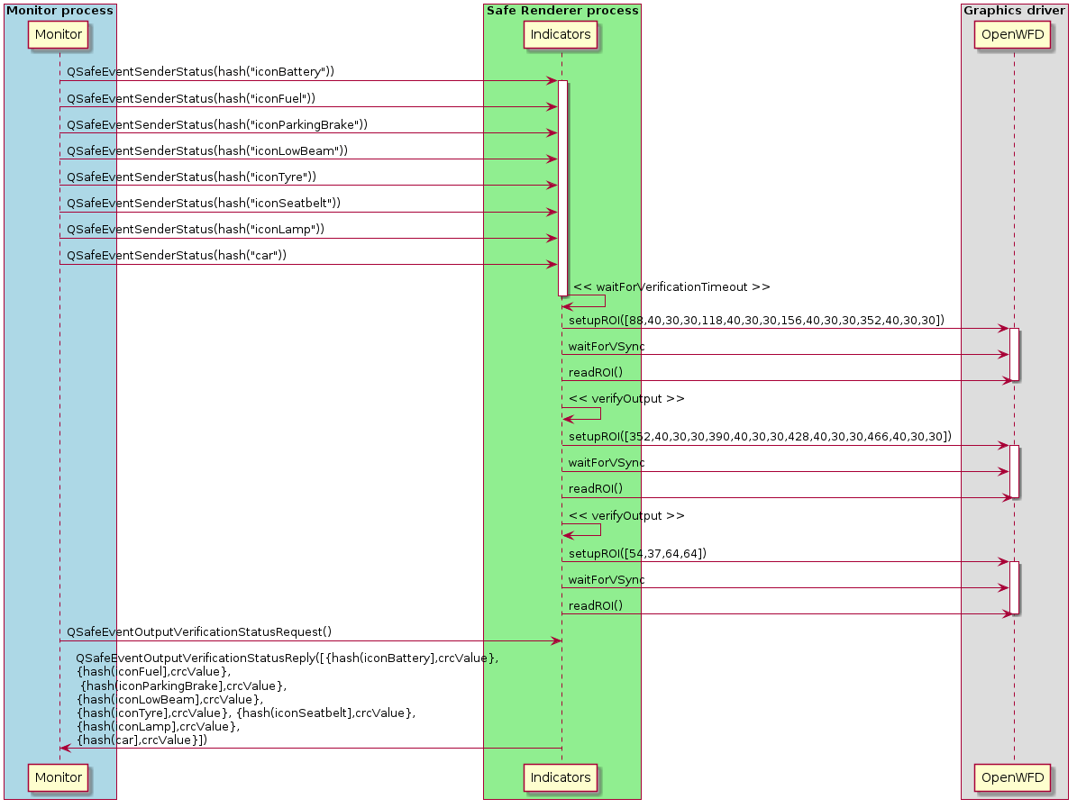 As you have enabled the output verification in Indicators, Monitor automatically changes the visibility of telltales and position of gears in Indicators. The telltales and gears are implemented with safety-critical QML types and when their visibility changes, Monitor reads the expected CRC (Cyclic Redundancy Check) value from the layout file and compares it with the actual CRC value.