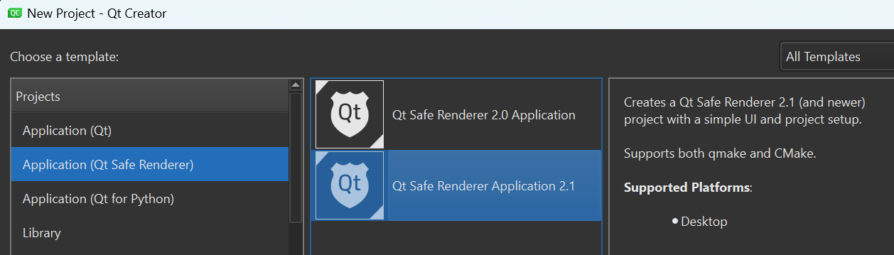 From Qt Creator 10.0.1 onwards, you can generate a new Qt Safe Renderer project by using a project template. The Qt Safe Renderer Application 2.1 project template supports both cmake and qmake build systems.