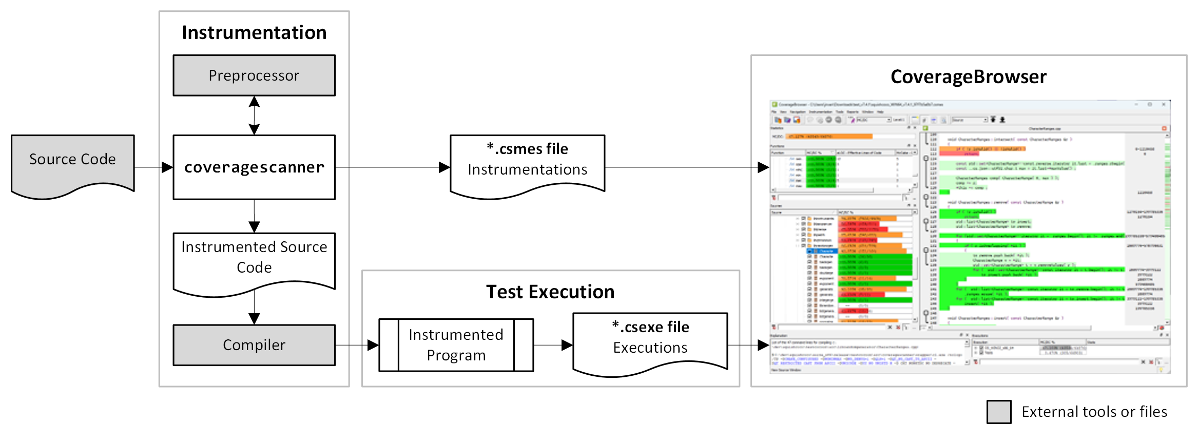 CoverageScanner is a command line tool that replaces the compiler normally used to build the executable, library, or plugin. It inserts special instrumentation instructions into the preprocessed source code and then uses the original compiler to compile the modified code. At the same time, a database (the .csmes file) is generated for later analysis. It contains the list of instrumentations and a copy of the instrumented source code.