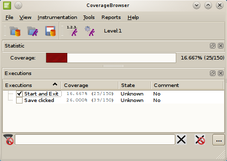 Once all the tests are finished, the black-box database can be merged into the original TextEdit instrumentation database using CoverageBrowser's merge facilities (File > Merge with).