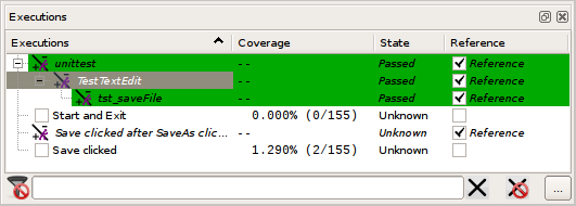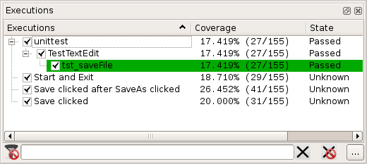 Click Tools > Analysis of Modified Functions to exclude all unmodified functions from the coverage analysis. In the TextEdit case, doing this will mean that only one function, TextEdit::fileSave(), will be treated as being instrumented since that is the only method we have changed. This also affects the statistic calculations since execution coverage statistics will now be limited to just this function. The test executions whose coverage statistic is not zero are the ones that are affected by the code modifications we have made.