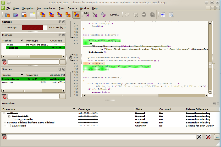 We have done just such a comparison and the results are shown in the image above. The two tests, Save clicked and Start and Exit, cover 85% of the TextEdit::fileSave() function, the only method that was modified for our fix. From this we know exactly what additional testing is necessary to achieve 100% code coverage for our tests for the fixed version of the application. CoverageBrowser continues to display the list of missing tests (which are only executed using the first version of TextEdit) in strikeout style. This gives a hint of what remains for testing effort.