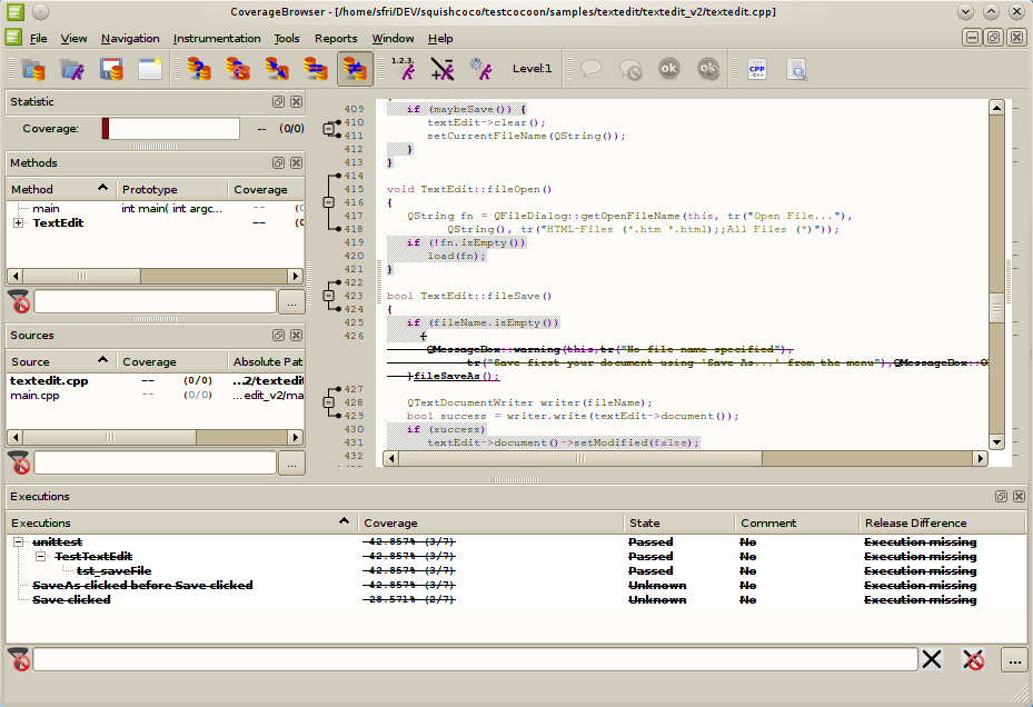 CoverageBrowser reveals, for example, that the TextEdit::fileSave() function is not executed. We will now validate this function interactively, guided by the code coverage analysis.