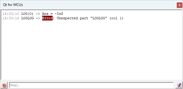 Once the board is selected, a console window appears. It displays the output of the function that permits printf-debugging by redirecting the output of the function qul_printf into it. A timestamp and a primitive coloring is provided for the keywords 'error' and 'warning'.