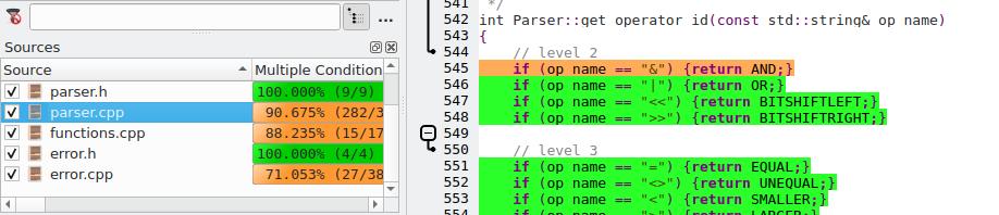 A quick glance at the coverage of the get_operator_id() function shows us that the ampersand operator (&) is not covered, so any test data row that uses that operator will increase the overall coverage.