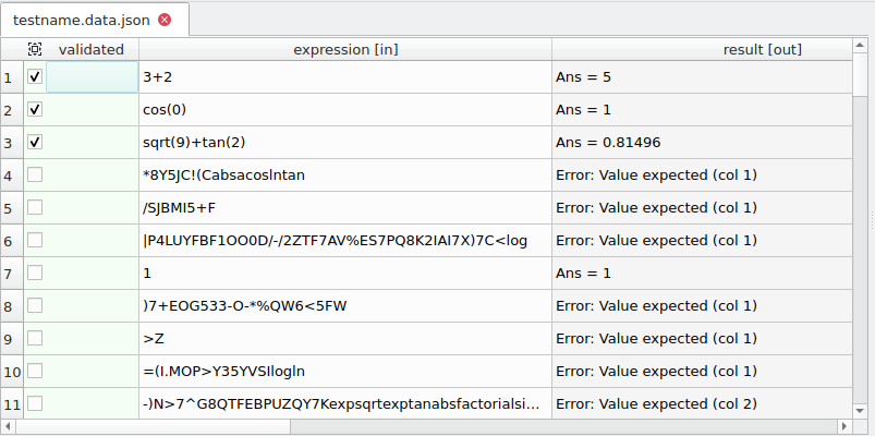 }After the discovery has been run, we can see all of the rows in testname.data.json, using a text editor, or better still, in a proper table using testdataeditor. Notice in the image below that the discovered rows are not validated while the first 3 rows are.