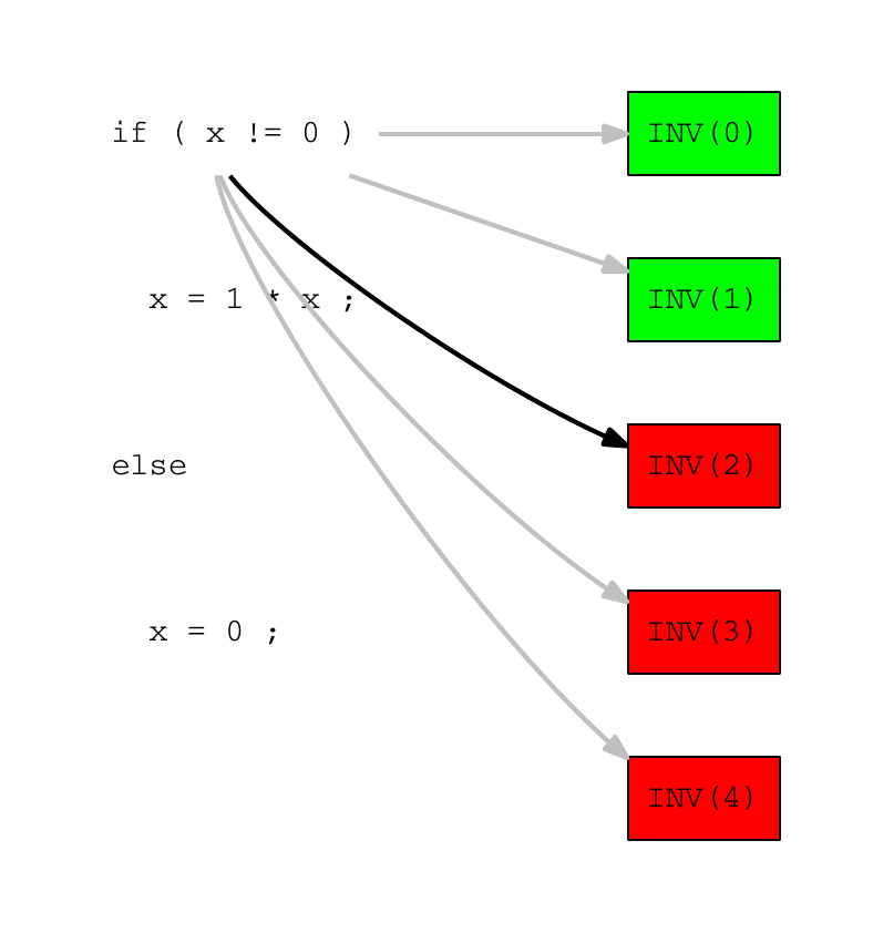 The algorithm then selects randomly the test INV(1) in the set of tests executed by the line x = 1 * x (INV(1), INV(2), INV(3) and INV(4)):