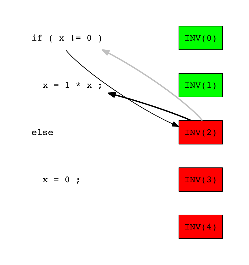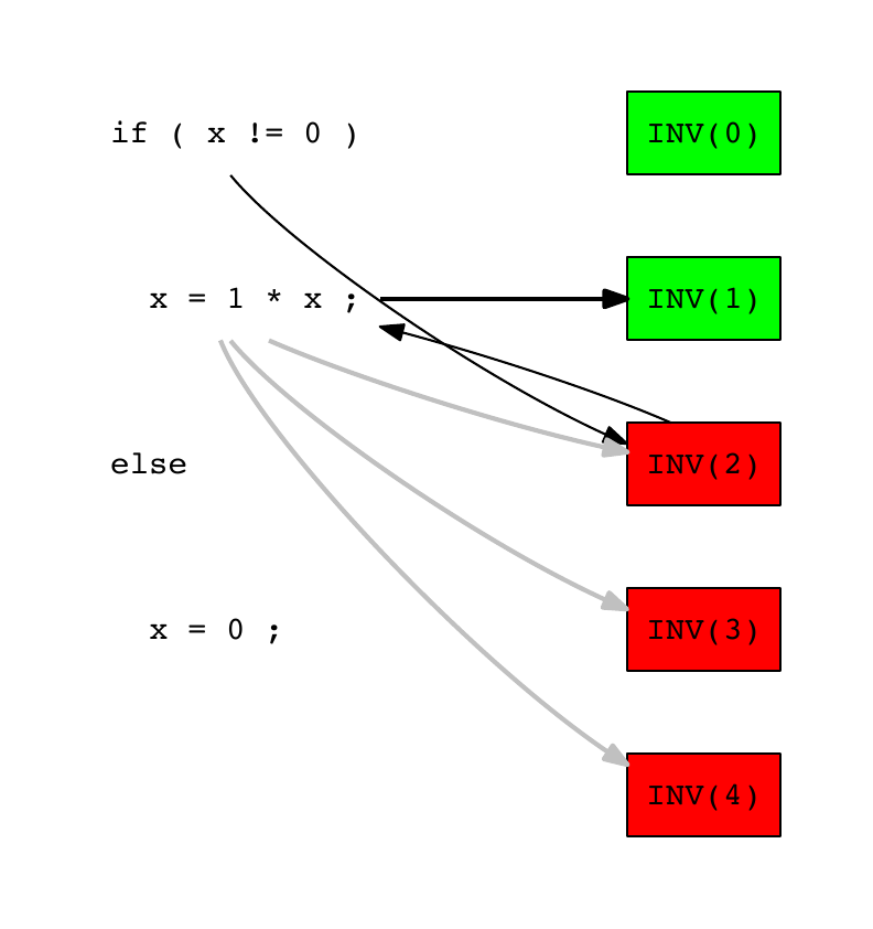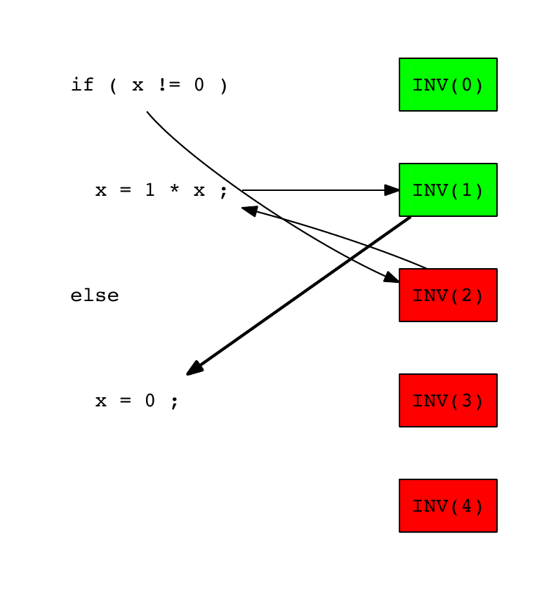 The test INV(1) was passed, so we assume that a source code line which is not executed by this test is responsible of the error. We select x = 0; as the next candidate: