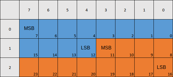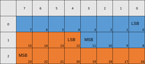 Here the columns represent bit numbers, and the rows represent byte numbers. LSB marks the first (least significant) bit of the value, and MSB marks the last (most significant) bit of the value. The blue color marks the first value, and the orange color marks the second value.
