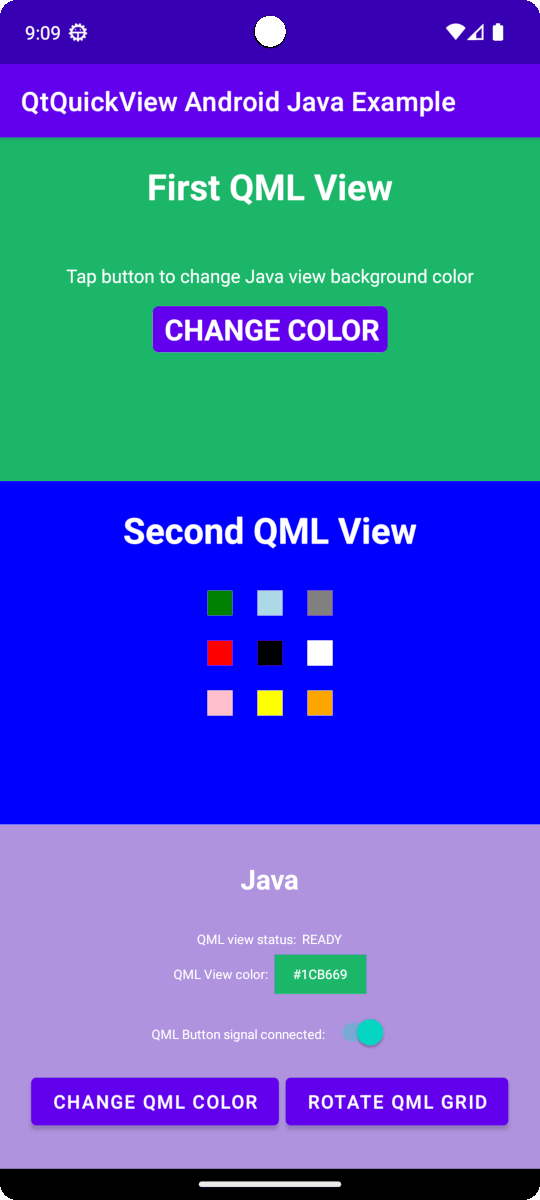 With the m_mainQmlContent.setColorStringProperty() method we set the colorStringFormat property value of the m_mainQmlContent a random color value that is fetched from the Colors.java (or Colors.kt) class.