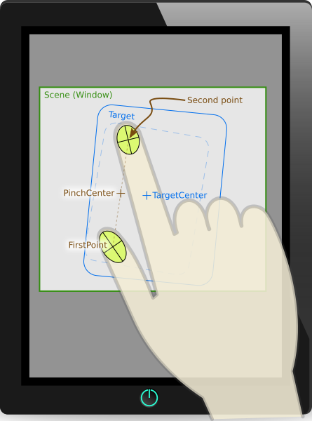PinchHandler is a handler that interprets a multi-finger gesture to interactively rotate, zoom, and drag an Item. Like other Input Handlers, by default it is fully functional, and manipulates its target, which is the Item within which it is declared.