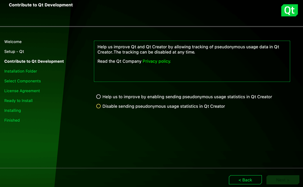 On the next step, the installer asks you to contribute to Qt development by tracking usage data.