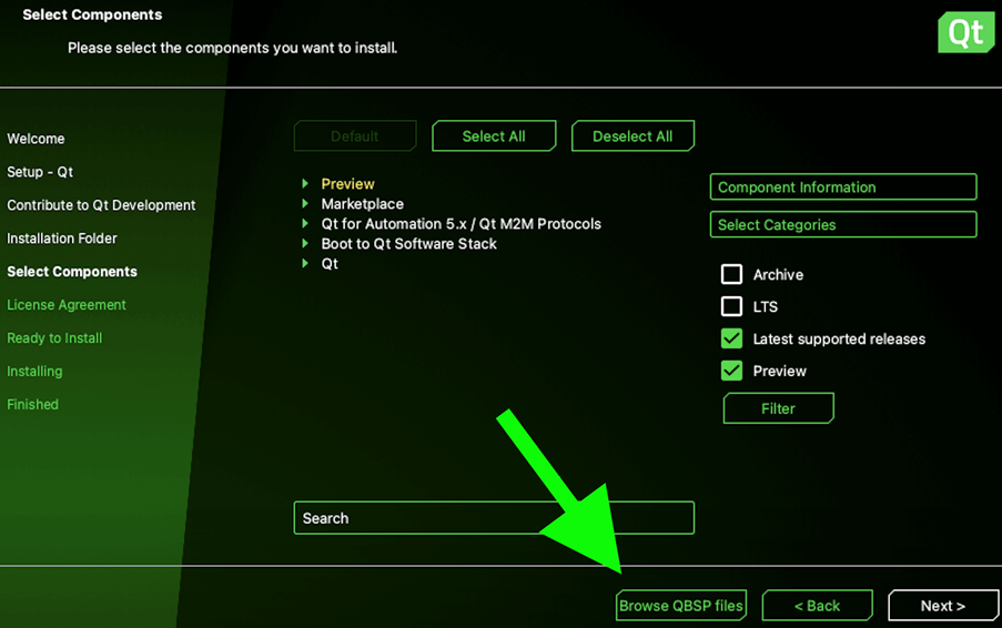 Select Browse QBSP files. In the file dialog window, locate and select the .qbsp file you downloaded from your Qt Account.