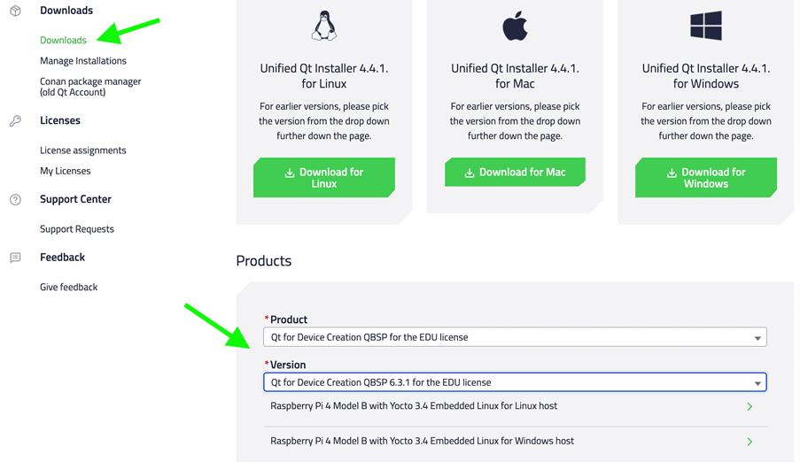 Log in to your Qt Account. Go to the Downloads section and select Qt for Device Creation QBSP for the EDU license from the drop-down menu in the Product field.