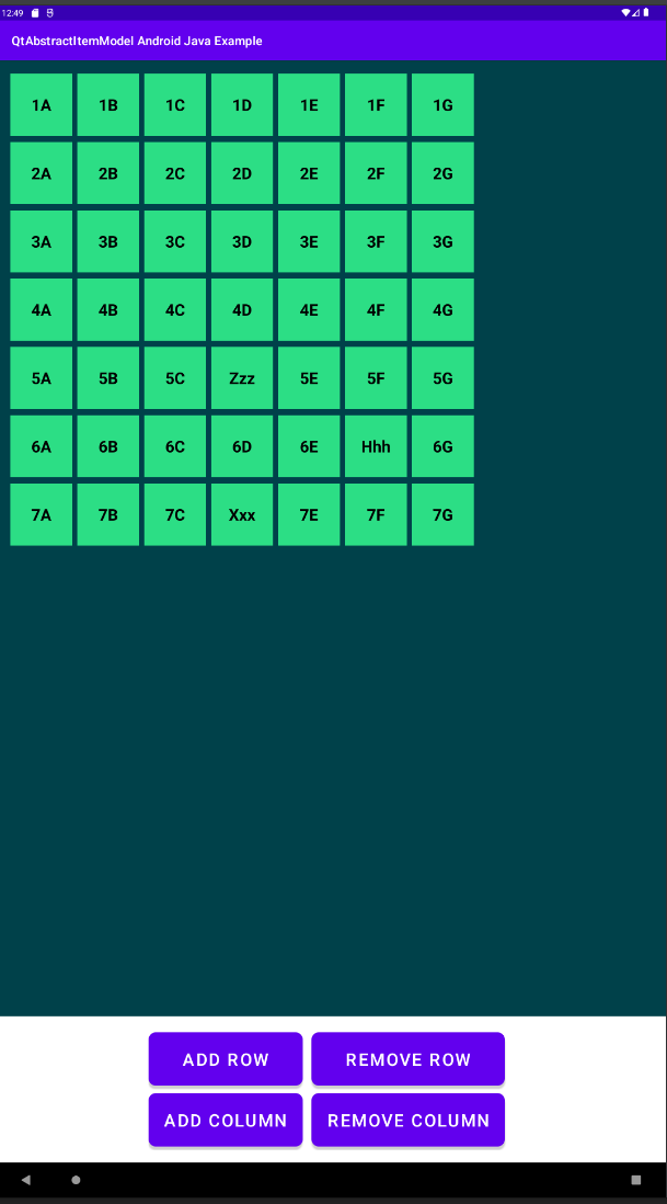The example implements methods on the model side for MainActivity UI interaction to add and remove rows and columns. Calls begin, end, insert, and remove rows to update model indexes, like beginInsertRow(). Because the example uses the QtAbstractItemModel, it must call beginInsertRows() and endInsertRows() every time it inserts new rows into the model. The same applies to removal. As the methods are called from the Android side, the execution takes place in the Android main thread context.