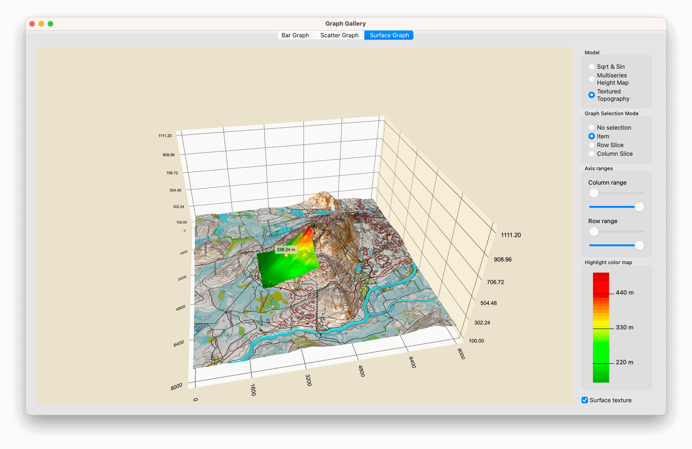 Since the HighlightSeries is QSurface3DSeries, all the decoration methods a series can have are available. In this example, add a gradient to emphasize the elevation. Because the suitable gradient style depends on the range of the Y axis and we change the range when zooming, the gradient color positions need to be adjusted as the range changes. Do this by defining proportional values for the gradient color positions: