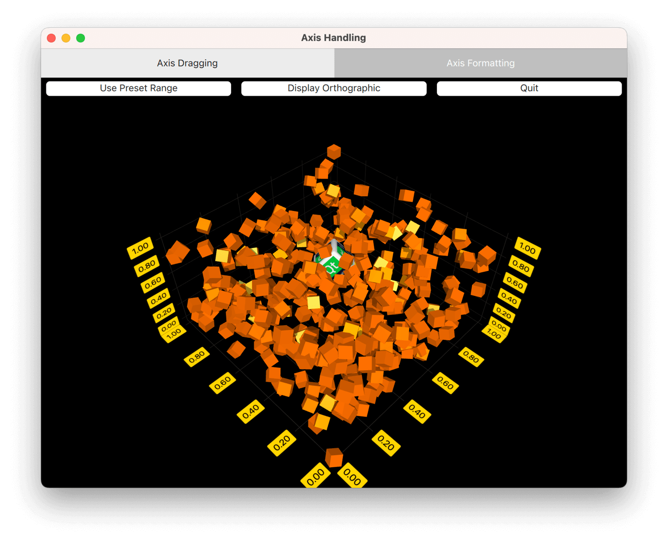 In the Axis Dragging tab, implement a custom input handler in QML that enables you to drag axis labels to change axis ranges. Further, use orthographic projection and dynamically update the properties of a custom item.