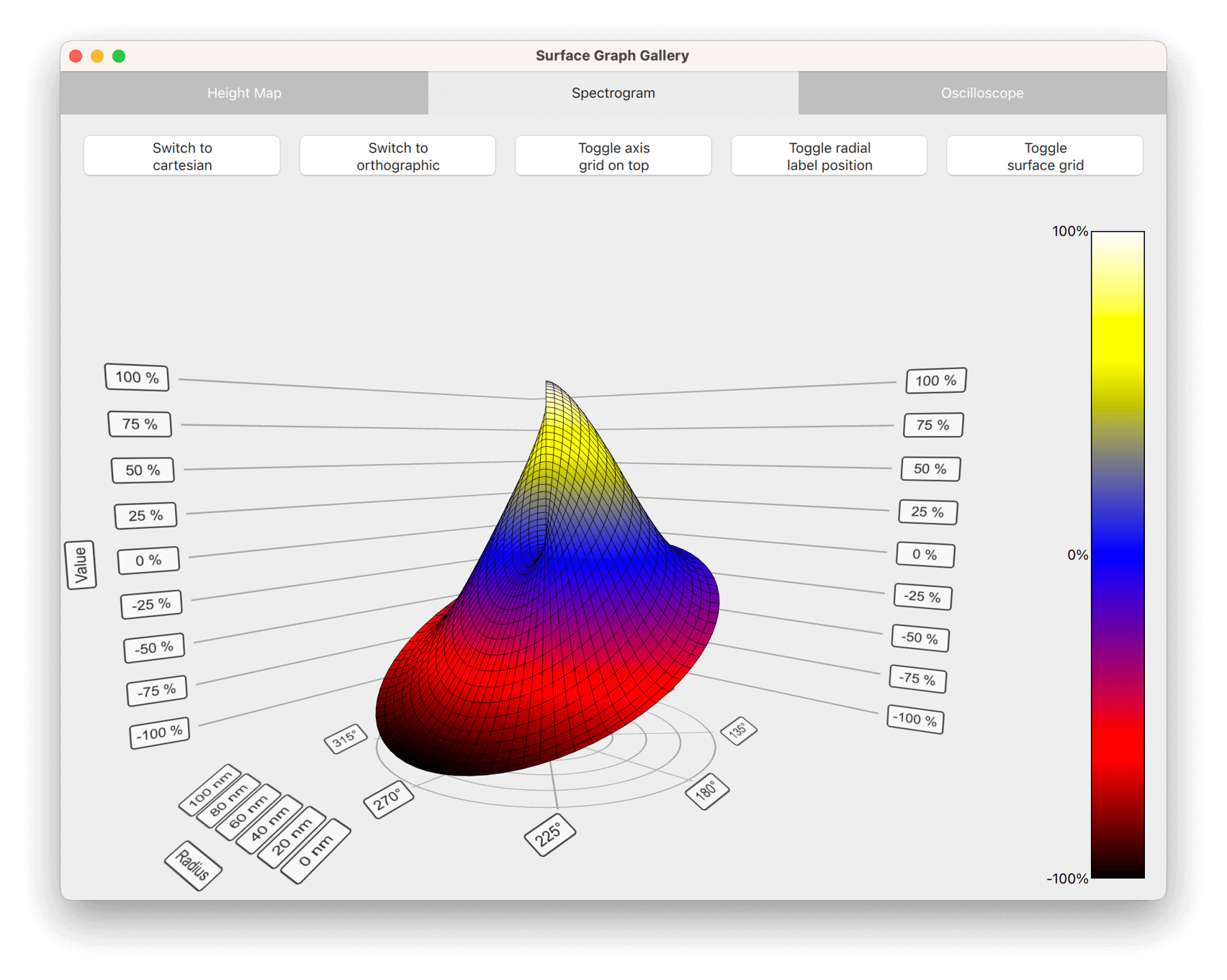 A spectrogram is a surface graph with a range gradient used to emphasize the different values. Typically, spectrograms are shown with two-dimensional surfaces, which is simulated with a top-down orthographic view of the graph. To enforce the 2D effect, disable the graph rotation via mouse or touch when in the orthographic mode.