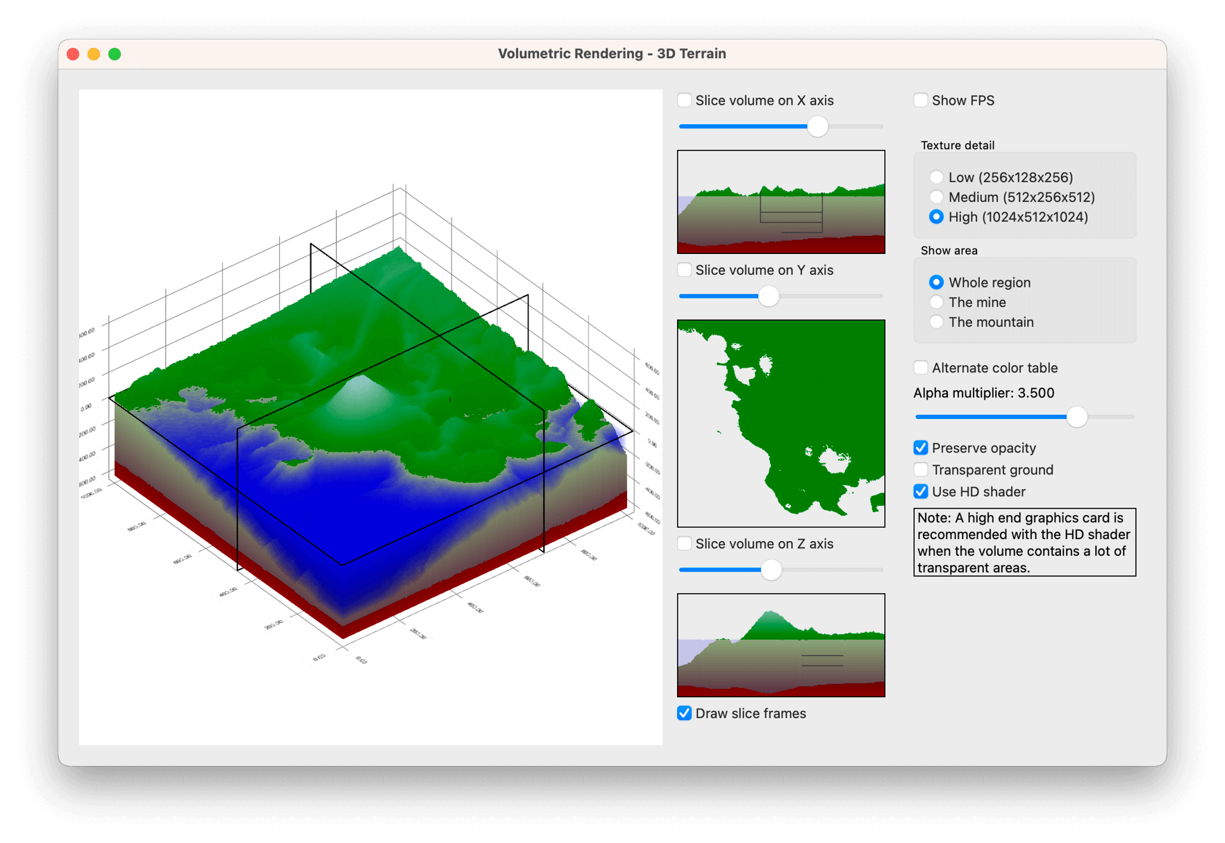 By default, the volumetric rendering uses a high definition shader. It accounts for each voxel of the volume with the correct weight when ray-tracing the volume contents, providing an accurate representation of even the finer details of the volume. However, this is computationally very expensive, so the frame rate suffers. If rendering speed is more important than pixel-perfect accuracy of the volume contents, take the much faster low definition shader into use by setting QCustom3DVolume::useHighDefShader property false. The low definition shader achieves the speed by making compromises on accuracy, so it doesn't guarantee that every voxel of the volume will be sampled. This can lead to flickering or other rendering artifacts on the finer details of the volume.