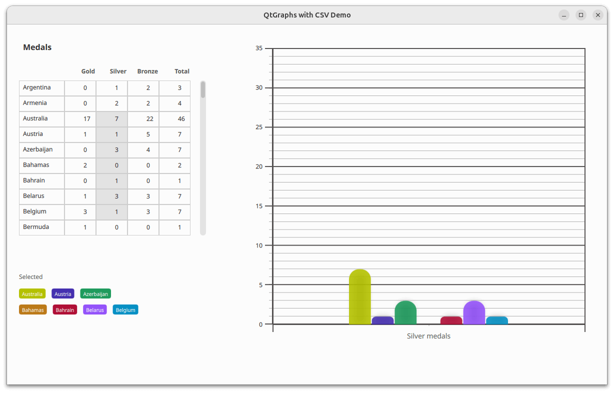 The Graphs with CSV Data example shows how to display data from a CSV file in a 2D bar chart. The application reads the CSV file using a third-party CSV parser. The data is inserted into a custom model that inherits from the QAbstractTableModel. After the data is inserted into the model, the leftmost column contains the vertical header data, while the top row contains the horizontal header data.