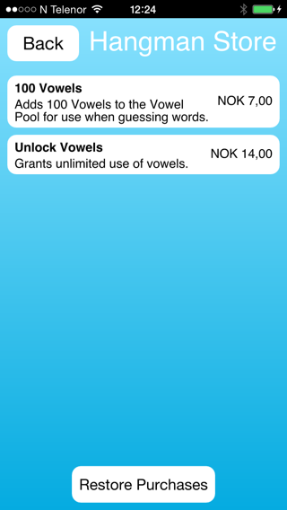 This demo is a mobile game application based on the classic word guessing game Hangman, where vowels can be purchased through the demo's internal store. In the game you will be presented with a row of dashes, representing letters of the word to guess. By guessing a correct letter that occurs in the given word, the letter will be placed on the corresponding dash or dashes in the word. By guessing every letter of the word or just guessing the whole word correctly at any time the game is over and you have won. If the guess is wrong, one element of a hanging stick figure is drawn. Once the figure is complete, you are out of guesses and you lose.