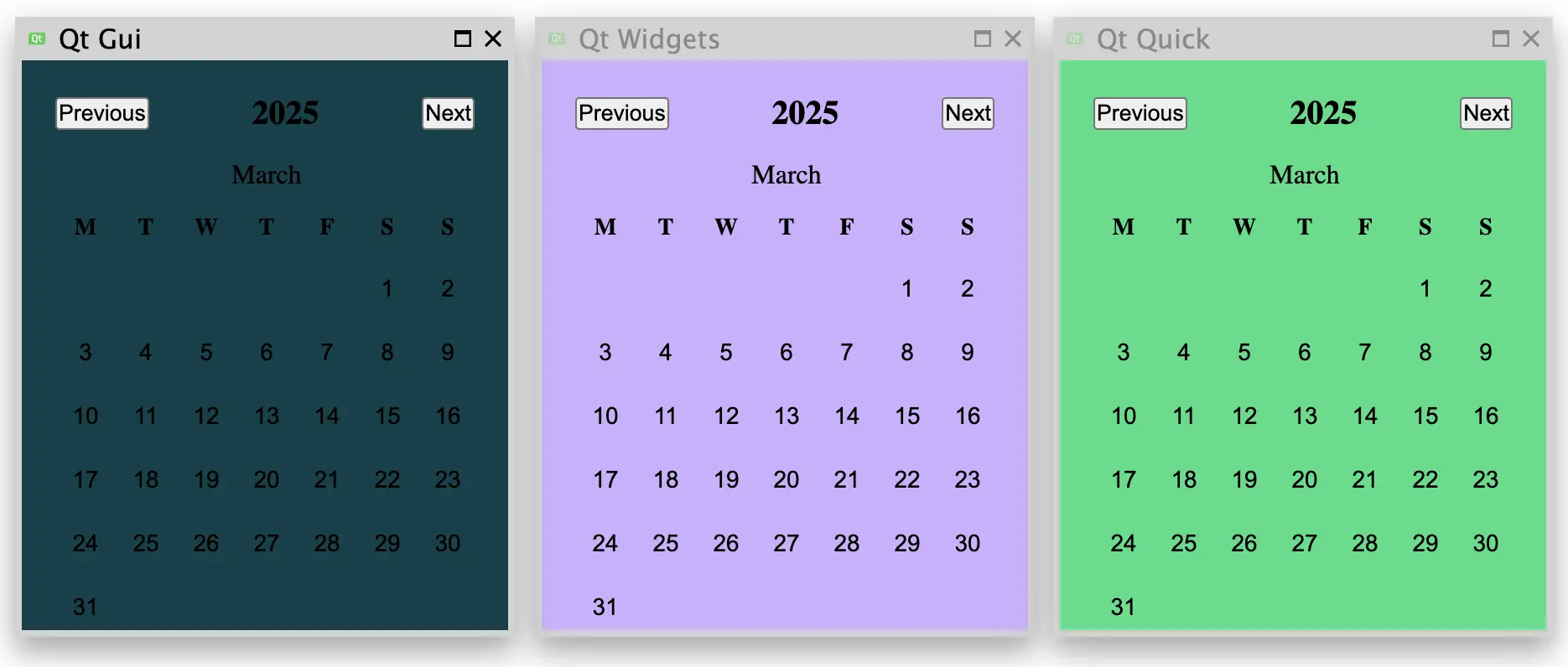 QWidget widget; widget.setPalette(QColor("#CDB0FF")); widget.setWindowTitle("Qt Widgets"); widget.setLayout(new QVBoxLayout); widget.layout()->setContentsMargins(contentsMargins); widget.layout()->setAlignment(Qt::AlignCenter); auto *calendarWidget = QWidget::createWindowContainer(createCalendarWindow()); widget.layout()->addWidget(calendarWidget);