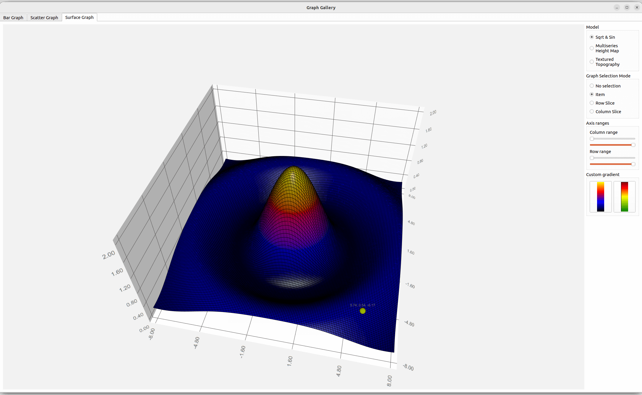 With the Sqrt & Sin data set, custom surface gradients can be taken into use with two push buttons. Define the gradient with QLinearGradient, where the desired colors are set. Also, change the color style to Q3DTheme::ColorStyle::RangeGradient to use the gradient.