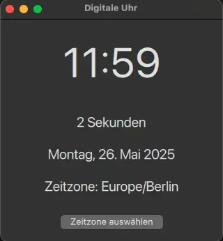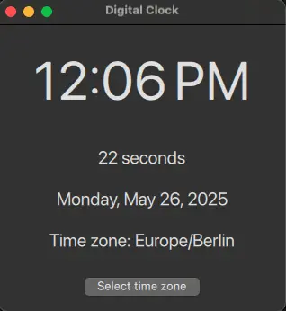 By default, the application shows the time and date in the current locale, but it also provides a button that opens a dialog with a list of time zones. The user can use the dialog to change the time zone of the clock.