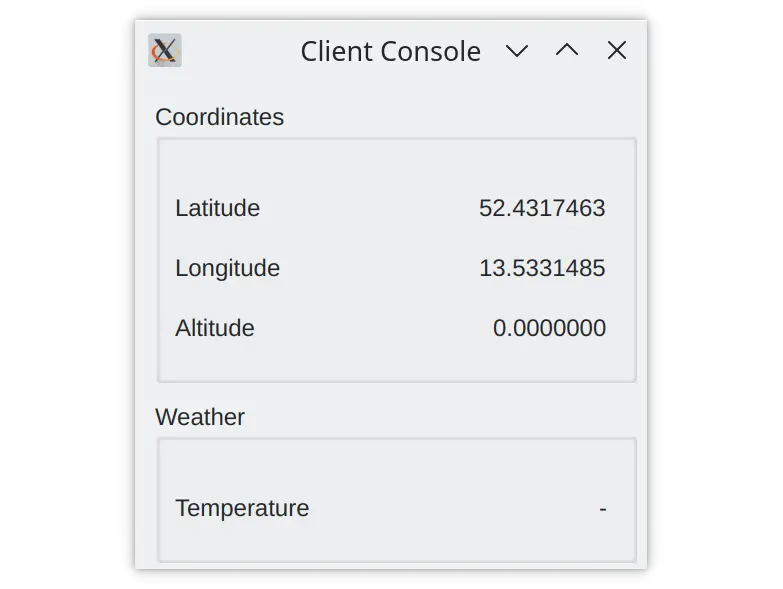 Screenshot showing an emulator console application to send coordinates, weather temperaute, and a warning message