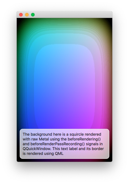 The example is equivalent in most ways to the OpenGL Under QML, Direct3D 11 Under QML, and Vulkan Under QML examples, they all render the same custom content, just via different native APIs.