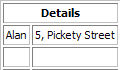 Original Table | Suppose we have a 2x3 table of names and addresses. To merge both columns in the first row we invoke mergeCells() with row = 0, column = 0, numRows = 1 and numColumns = 2.table->mergeCells(0, 0, 1, 2); |