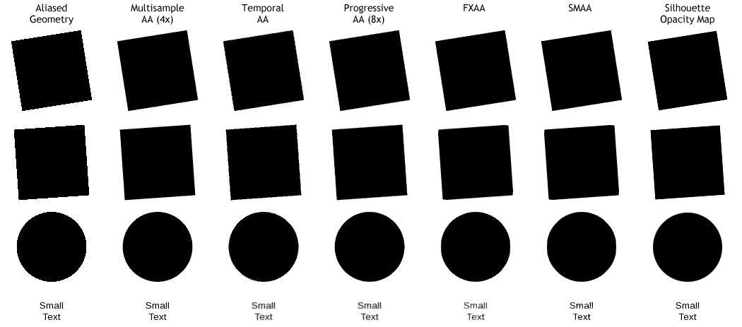 Supersample AA (SSAA) operates on an entire layer, or even multiple layers. It is not mentioned or compared above because the performance penalty can be severe, and because it requires additional work from the artist. This technique should be used as a last resort.