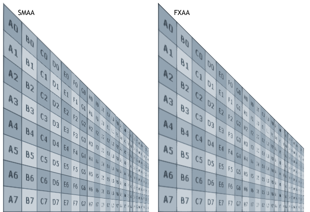 - Cons: because it is based on the already-aliased image, the fixes that it makes are usually blurring/hiding extra information instead of adding additional information (see the corner between "G4" and "H5" in the Texture Anti-Aliasing example); it can negatively effect fine text details (see the "small text" on the Geometry Anti-Aliasing example).