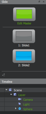 To distinguish between the two slides and more easily see the effect of dynamic keyframes, it is recommended to set for example different diffuse color on the sphere on the two different slides. Remember to first unlink the diffuse color property from the master slide.