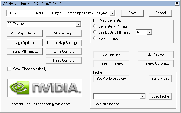 The most important settings are the drop-down list at the top used to select the DDS encoding, and the MIP map section.