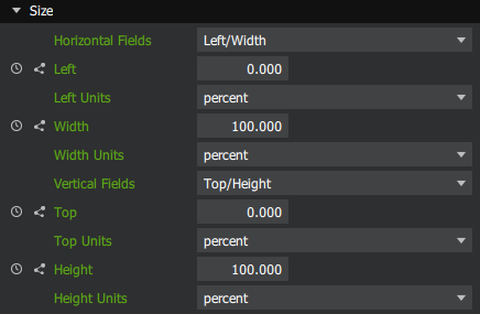- Horizontal Fields - Choose which two fields of Left, Width, and Right are used to control the horizontal placement and sizing of the layer within the presentation. Each of these values can be set either in pixels or as a percentage of the presentation width.