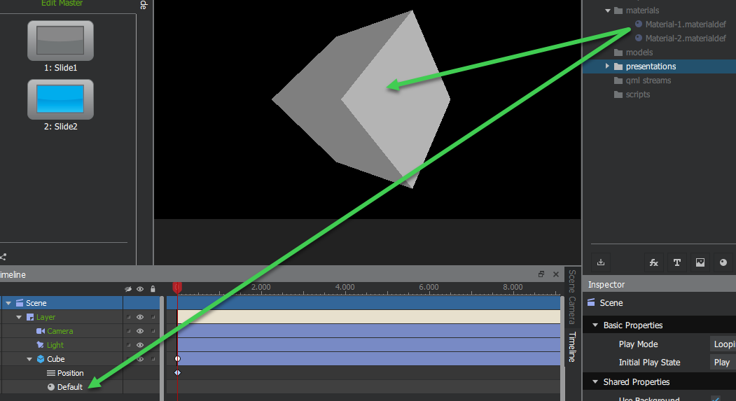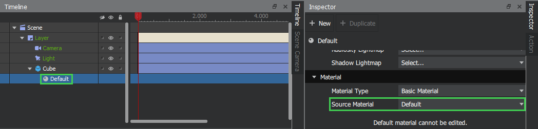 The basic material is used for materials without any property animations. You can create your own basic materials, save them in your project, and assign them to objects. Basic materials are saved as .materialdef files in the materials folder of your project.