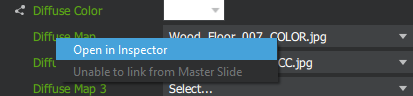 To edit a texture map, right-click the map property name in the inspector palette and select Open in Inspector from the context menu.