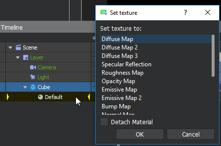 Additionally, you can apply a texture map by dragging the image from the project palette to the material in the scene graph. When you drop the image on the material, you can select which type of map you want to apply the image as.